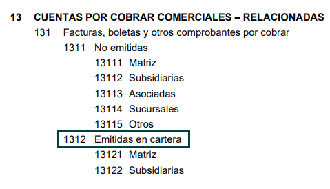 Para la siguiente casuística, usaremos la cuenta 1312, que significa «Cuentas por cobrar comerciales – Relacionadas, emitidas en cartera»