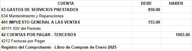 El día 15 de enero de 2025, la empresa Servicios Innovadores SAC recibe un comprobante emitido por Logística Global EIRL, correspondiente a la factura N° 002-234567 por un monto de S/850.00. La factura, fechada el 20 de noviembre de 2024, se refiere al mantenimiento de equipos de oficina.