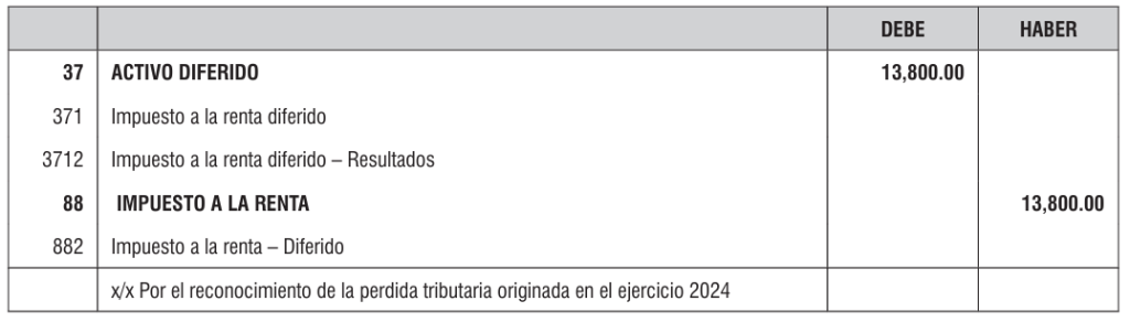 Por último, considerando que la pérdida tributaria generada por la empresa en el ejercicio 2024 podrá ser utilizada en los ejercicios siguientes de conformidad con el sistema elegido, contablemente deberá evidenciarse esta situación; para tal efecto, aplicaremos la tasa del Impuesto a la Renta sobre el monto de la pérdida tributaria generada, tal como se muestra a continuación: