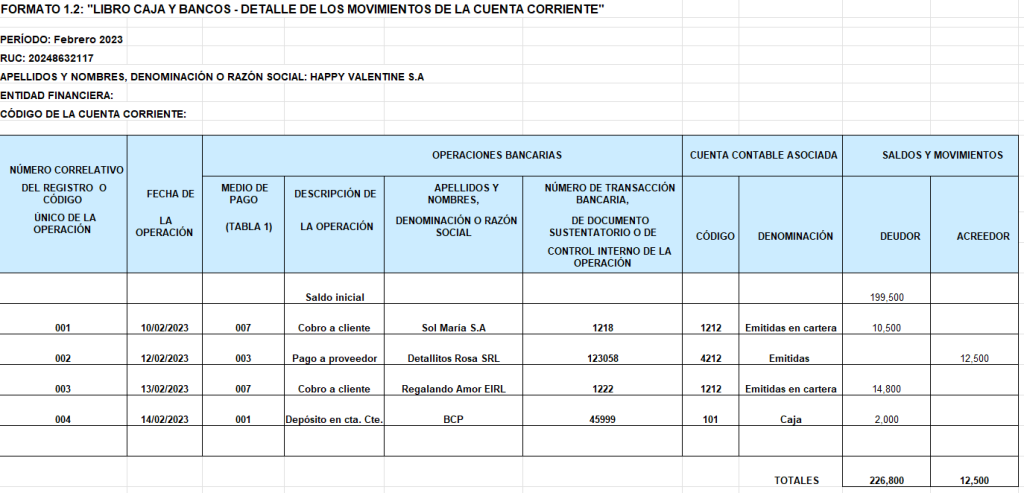 FORMATO 1.2: LIBRO CAJA Y BANCOS – DETALLE DE LOS MOVIMIENTOS DE LA CUENTA CORRIENTE: