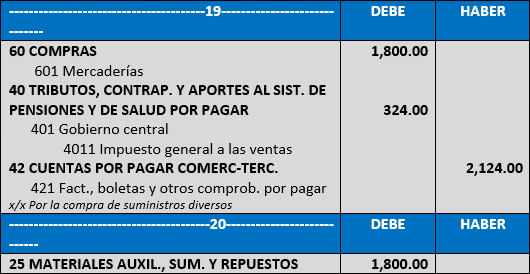 - Se compra útiles de escritorio para stock por S/. 1,800.00 más IGV, a KIN WAN SA, según factura N. º 4652.