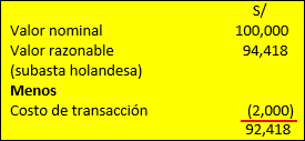 La empresa ANGELITO emite un bono con valor nominal de S/ 100,000 en el mercado bursátil local con una tasa de 8 % con vencimiento en 5 años. La empresa coloca con éxito el total de la emisión en el mercado local mediante “subasta Limeña”, y recibe por la colocación S/ 94.418. Los costos de transacción son de S/ 2,000 por única vez.