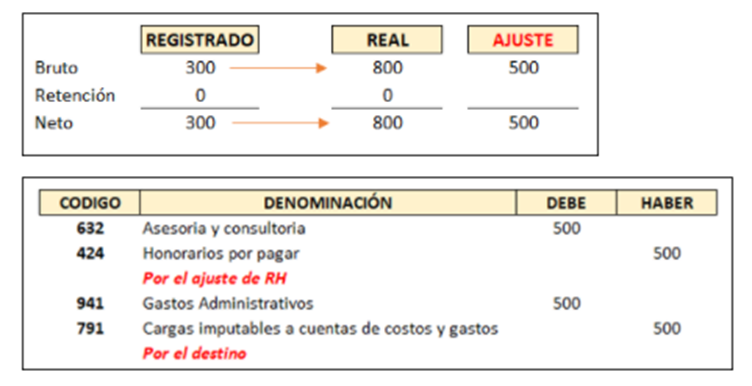 Al efectuar la revisión de los recibos por honorarios administrativos, el contador se percata que se registró como monto bruto el importe de S/ 300, cuando el monto real según RH E001-13 es de S/ 800.
