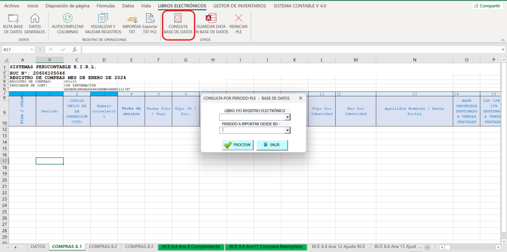 Al usar la función CONSULTA BASE DE DATOS, podemos revisar cómo está llenado nuestro libro electrónico, asegurándonos de que toda la información esté correcta antes de proceder a la exportación del TXT.