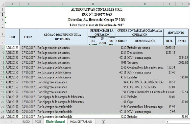 Libro diario: En esta estructura ingresaremos nuestro libro diario que nos servirá para generar la hoja de trabajo, la forma de ingreso es mediante copiar y pegar.