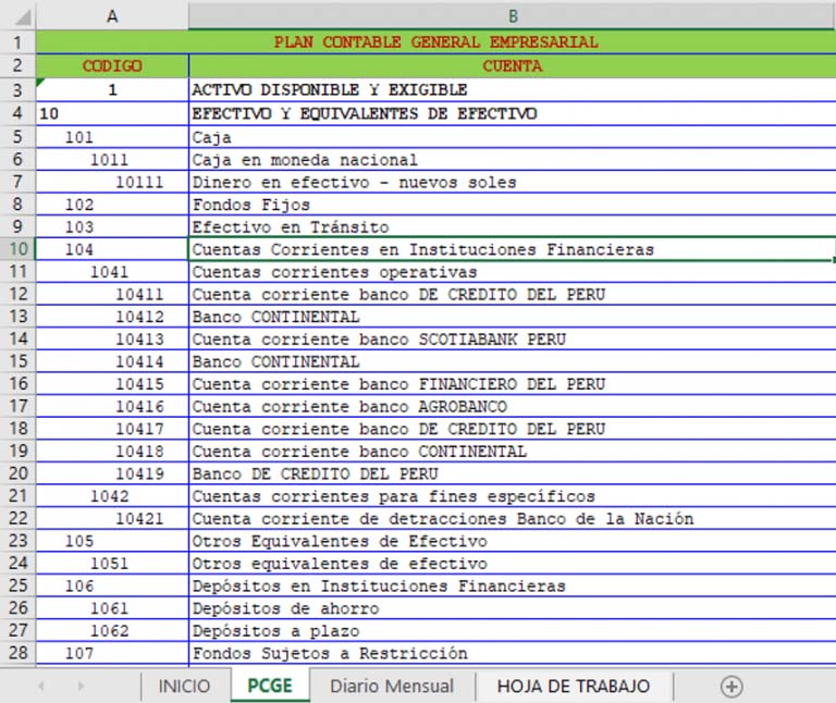 PCGE: Plan contable general empresarial, esta hoja contiene la data del catalogo de cuenta que usaremos tanto para el diario como para la hoja de trabajo.