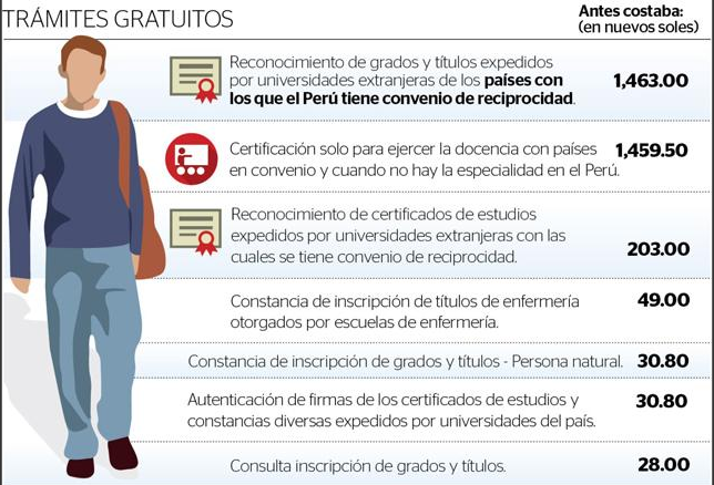 Entre los trámites gratuitos que ofrece la Sunedu figuran la constancia de inscripción de grados y título-empresas e instituciones hasta 50 constancias, cuyo precio era de 15.40 nuevos soles.