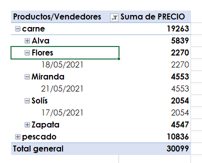 Para ilustrar otra posibilidad, vamos a ver todas las ventas de embutidos. En el caso de los vendedores, se eliminará el filtro al hacer clic en el sitio que circula en la imagen. Podemos observar que, aunque todos los vendedores están habilitados (ya que el filtro fue removido), sólo se resaltan los nombres de los que efectuaron ventas en el producto elegido.