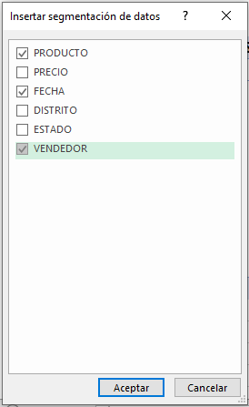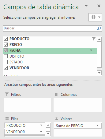 La inserción de la tabla dinámica es posible en la opción correspondiente ubicada en la pestaña «insertar», después de seleccionada la tabla original. Al confeccionar la tabla, vamos a utilizar los campos «producto», «precio», «fecha» y «vendedor».