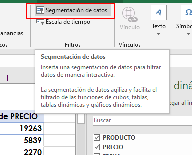 Para insertar la segmentación de datos en una tabla dinámica (o en cualquier otra tabla que tenga), debe seguir algunos pasos muy simples. El botón de inserción de Segmentación de datos está disponible en la barra de herramientas dentro de la ficha Insertar, en el grupo Filtros.