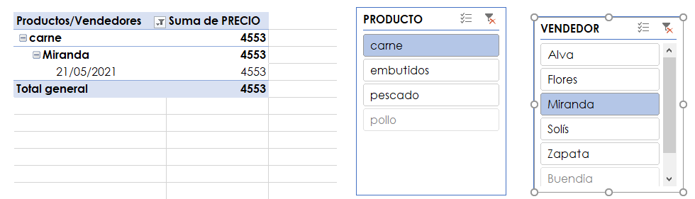 Ahora que ha configurado su tabla de segmentación de datos, el uso es muy simple. En este caso, creamos segmentación de datos para productos y vendedores. Con esto, es posible comparar el desempeño de ciertos vendedores en relación a cada producto, aplicando los filtros deseados. Por ejemplo, para filtrar la producción del vendedor Miranda en el producto carne, habilitaremos el producto y el vendedor en los segmentos correspondientes. Tenga en cuenta que las opciones seleccionadas serán azules.