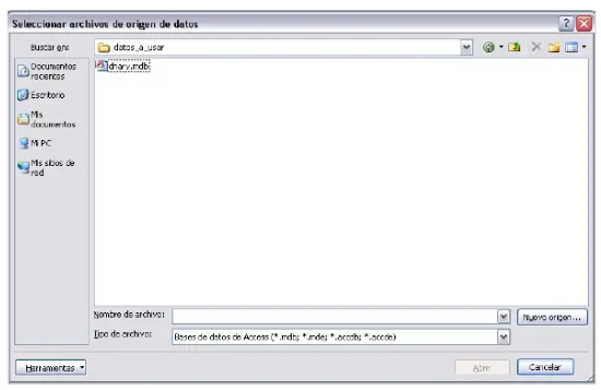 Este comando mostrará el cuadro de dialogo Seleccionar archivos de origen de datos en donde deberás especifcar el archivo Access que deseas abrir: