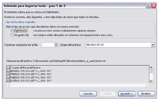 Después de seleccionar el archivo adecuado, debes hacer clic en Importar. Esto abrirá el primer paso del Asistente para importar texto, el cual es fundamental, ya que permite especificar el tipo de archivo a importar, ya sea uno que utilice un carácter específico como delimitador o un archivo con un ancho fijo de columna.
