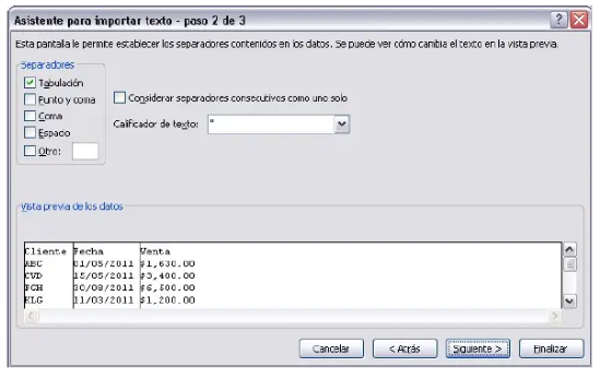 De igual manera, en este paso se puede indicar a Excel que comience a importar a partir de una fila específica del archivo. Al hacer clic en el botón Siguiente, Excel sugerirá el tipo de separador detectado dentro del archivo a importar, y generalmente, su sugerencia será acertada. No obstante, se recomienda validar que en la vista previa los datos estén correctamente separados.