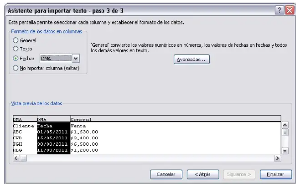 Solo tienes tres opciones: General, Texto y Fecha. Es recomendable prestar especial atención a las fechas para facilitar su manejo e interpretación en Excel después de la importación. Al hacer clic en el botón Finalizar, se te preguntará la ubicación dentro de la hoja de Excel donde se insertarán los datos importados.
