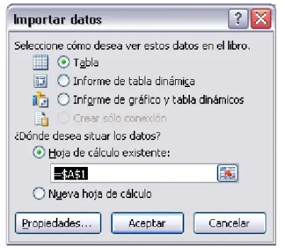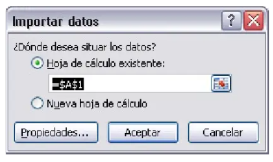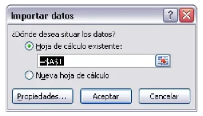 Inmediatamente se mostrará el cuadro de diálogo Importar datos que te preguntará la ubicación donde deseas situar los datos. Haz clic en Aceptar.