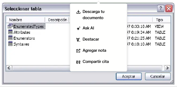 Observa los íconos amarillos que aparecen, los cuales indican las tablas de datos disponibles para seleccionar. Haz clic sobre el ícono de la tabla deseada (el ícono cambiará a color verde) y luego presiona el botón «Importar».