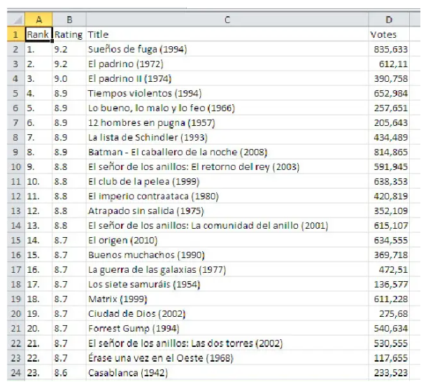 Se abrirá el cuadro de diálogo «Nueva consulta web» y en el campo Dirección, ingresaremos la siguiente URL: http://www.imdb.com/chart/top (esta dirección muestra las 250 mejores películas según IMDB).