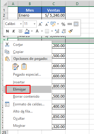 Por supuesto que, el método más básico y probablemente ineficiente, es eliminar fila por fila utilizando el comando Eliminar que se muestra al hacer clic derecho sobre el encabezado de una fila.