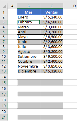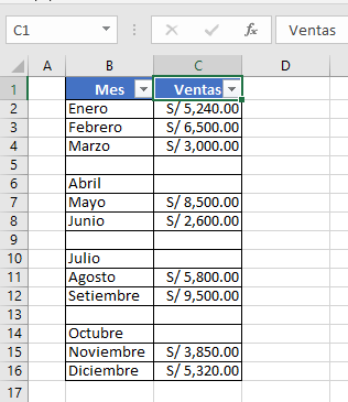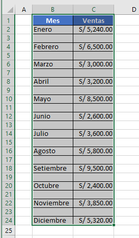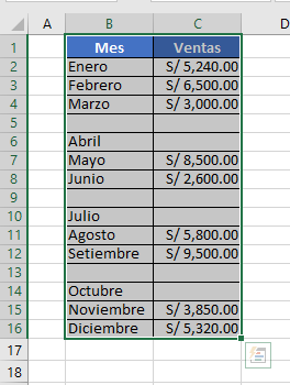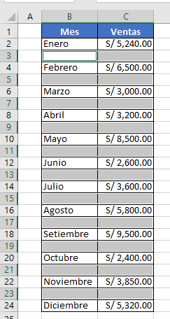 En los datos de este ejemplo, he utilizado el filtro de la columna Mes porque las celdas vacías de dicha columna me aseguran que eliminaré solamente las filas en blanco de los datos. Ahora tendremos en pantalla solamente las filas vacías de nuestros datos.