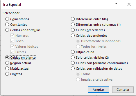 3. Se mostrará el cuadro de diálogo Ir a Especial y deberás hacer clic sobre la opción Celdas en blanco.