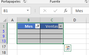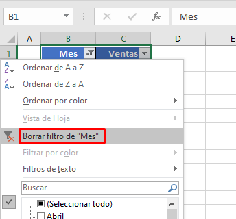 También puedes aplicar un filtro a los datos utilizando el atajo de teclado Ctrl + Shift + L. Una vez que los datos tienen filtro, hacemos clic sobre el botón de filtro de la columna Mes y marcamos el cuadro de selección Vacías.