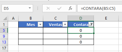 Si tenemos una tabla con muchos datos, será difícil saber saber si existen celdas vacías que pertenecen a filas que contiene algunos datos. Para tener la certeza de que eliminaremos filas que tienen todas sus celdas en blanco, te recomiendo utilizar una columna auxiliar que nos ayudará a garantizar que una fila está totalmente vacía. Para eso, utilizaremos la función CONTARA de la siguiente manera: