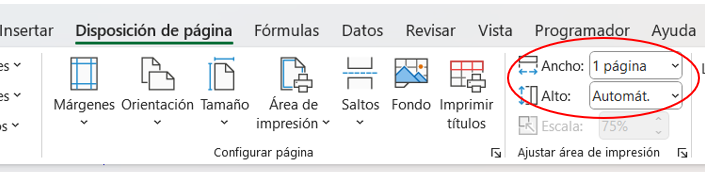 Es muy común que la hoja de cálculo en la que estás trabajando contenga columnas y filas que sobrepasen el área de impresión. En estos casos puedes optar por las opciones del “Diseño de página”, las cuales te permite ajustar el tamaño de la hoja para que se adapte a la página de impresión.