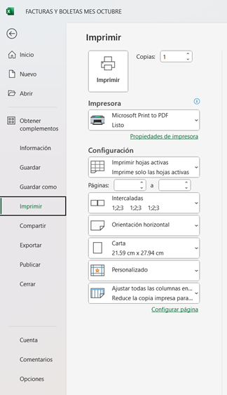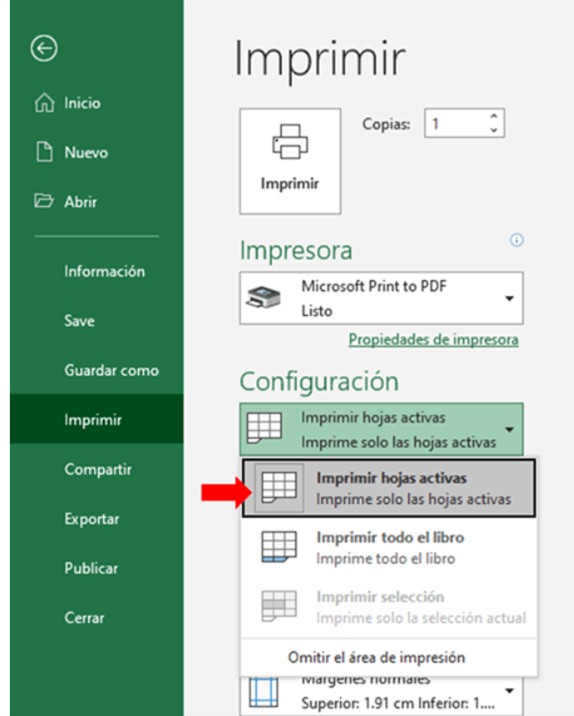 • En “Configuración” despliega el listado de opciones y selecciona “Imprimir hojas activas”.