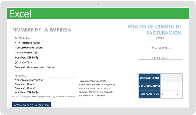 Un estado de cuenta de facturación es útil si recibe pagos regulares bimensuales o mensuales de sus clientes. Utilice esta plantilla de estado de cuenta para hacer un seguimiento de las facturas de los clientes, los detalles de la cuenta y el estado de la facturación, todo en un solo lugar. Además, esta plantilla tiene un aspecto profesional y se puede personalizar para adaptarla a sus necesidades.