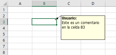 Excel permite agregar comentarios o notas a cualquier celda individual de una hoja. Estos comentarios son útiles para ofrecer datos complementarios, explicaciones o instrucciones detalladas asociadas al contenido de una celda. Cuando una celda tiene un comentario, aparece un indicador de color rojo en la esquina de la celda. Si deja el cursor sobre la celda, aparecerá el comentario.