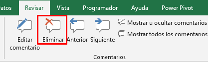 - Ir a la ficha Revisar y dentro del grupo Comentarios pulsar el botón Eliminar.