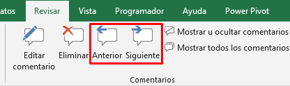 Cuando queramos revisar los comentarios de un libro uno a uno hacemos clic en una celda que contenga uno de los comentarios que deseemos revisar. A continuación, para revisar los demás comentarios, en la pestaña Revisar, en el grupo Comentarios, haga clic en Siguiente o Anterior para ver los comentarios de forma secuencial o en orden inverso.