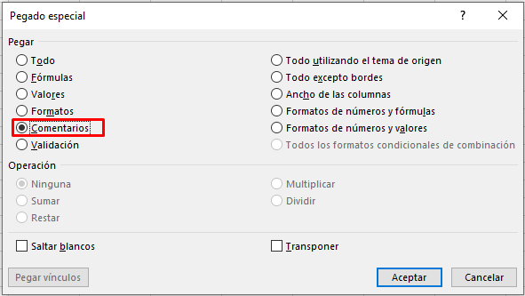 Le damos a Aceptar y pegará los comentarios en las celdas seleccionadas.