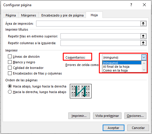 - Al final de la hoja: Imprime los comentarios al final de la hoja.