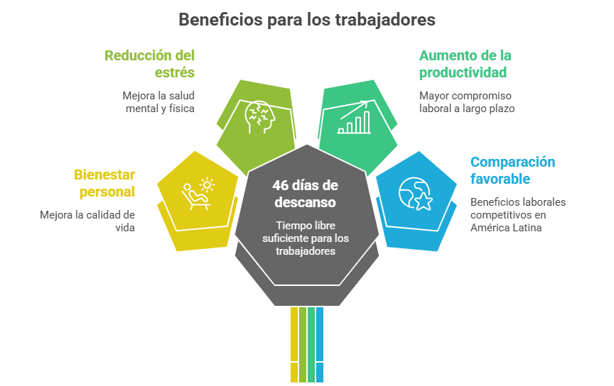 • Mayor tiempo de descanso: Los 46 días de descanso al año aseguran que los trabajadores puedan disfrutar de tiempo libre suficiente, lo que contribuye al bienestar personal y a una mejor calidad de vida.