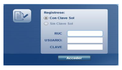 - Con clave SOL: Se ingresa el número de RUC, código de usuario y clave SOL, y al pulsar el botón “Acceder” se validarán dichos datos. Esta opción le permite ejecutar las opciones para validar y descargar datos en línea o sincronizar con el T-REGISTRO los datos del empleador y de sus trabajadores, pensionistas, personal en formación y personal de terceros para elaborar su declaración mensual.