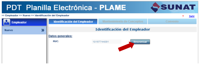 - Con clave SOL: Al ingresar el número de RUC, código de usuario y clave SOL válidos, el aplicativo se ubicará en la opción “Nuevo” del módulo “Empleador”, y luego de pulsar el botón “Sincronizar” el aplicativo verifica si el empleador se encuentra inscrito en el T-REGISTRO, de estar inscrito sus datos se descargan en línea (automáticamente) al PDT PLAME. Esta opción será utilizada si tiene conexión a internet.