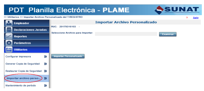 En el módulo Utilitarios contará con la opción “Importar Archivo Personalizado T-REGISTRO” que le permitirá importar el archivo generado en SOL.