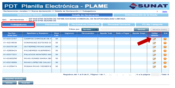 - Carga individual. Pulse el ícono “Editar detalle” y complete uno a uno los datos solicitados por el PDT PLAME.