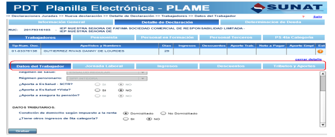 Deberá ingresar los datos que solicita el PDT en cada una de las secciones: Datos del trabajador, Jornada laboral, Ingresos, Descuentos y Tributos y aportes, y luego presione el botón “Grabar”. El aplicativo mostrará si los datos grabados son consistentes o