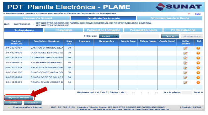 Para importar estos archivos ingrese a la sección Detalle de Declaración / Trabajadores y presione el botón “Importar archivo”.