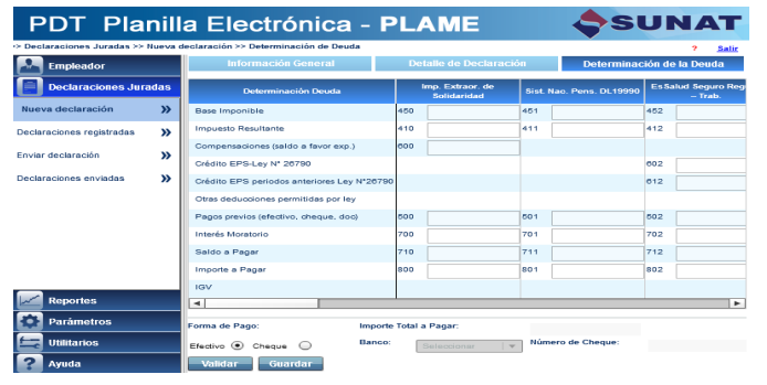Culminado el llenado de “Detalle de declaración”, verifique que todos los trabajadores, pensionistas y demás prestadores tengan estado consistente. De encontrarse consistente, ingrese a “Determinación de la deuda”, complete los datos de esta sección de la declaración,