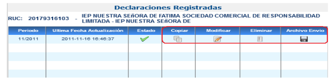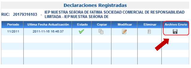 Cuando la declaración se grabó satisfactoriamente y no presenta inconsistencias, podrá generar el Archivo de envío de su declaración desde la opción “Declaraciones registradas” pulsando el ícono “Archivo de envío”.