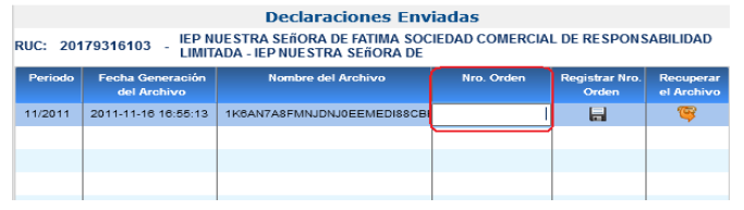 Una vez efectuada la presentación de su declaración podrá registrar en el PDT PLAME el número de orden de la misma.