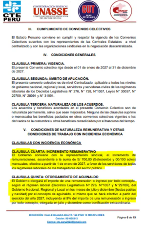 El documento contiene 44 cláusulas, entre económicas y de condiciones laborales, y abarca a los servidores de los tres niveles de gobierno y a todos los regímenes laborales del Estado, cuyas medidas empezarían a regir desde enero de 2027. Recordemos que la negociación colectiva está amparada en la Ley N.º 31188.