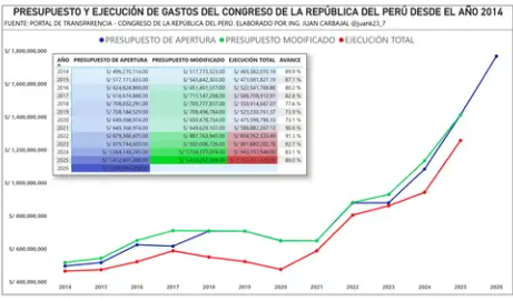 Un análisis elaborado por el ingeniero Juan Carbajal con datos de Transparencia revela que el Congreso de la República ha logrado duplicar su costo anual en apenas cuatro años. Pasó de gastar un presupuesto anual de S/588.8 millones en 2021 a S/1.412 millones en 2025.