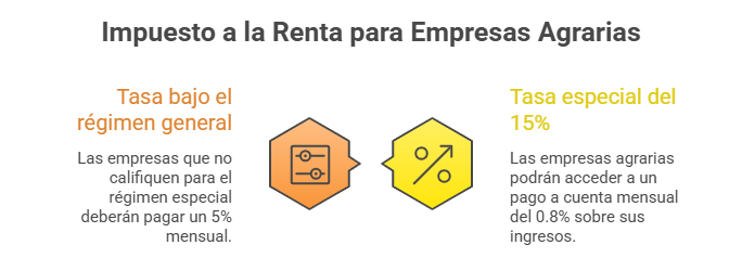 • Tasa especial del 15%: Las empresas agrarias podrán acceder a un pago a cuenta mensual del 0.8% sobre sus ingresos.