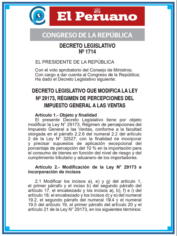 El Poder Ejecutivo, en ejercicio de facultades legislativas delegadas por el Congreso de la República, aprobó y publicó el Decreto Legislativo N° 1714, que modifica la Ley N° 29173, el Régimen de percepciones del Impuesto General a las Ventas (IGV).