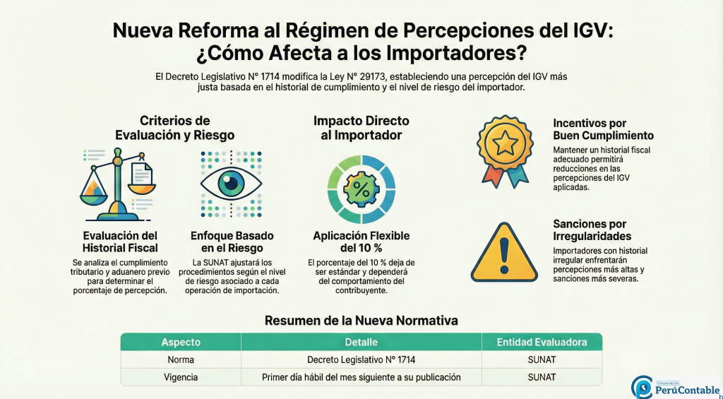 El Decreto Legislativo N° 1714 busca mejorar los procedimientos tributarios relacionados con la percepción del IGV para las importaciones. Esta modificación introduce criterios de evaluación más estrictos que tienen en cuenta el cumplimiento tributario y aduanero de cada importador, así como el nivel de riesgo asociado a las operaciones de importación. Esto permitirá a la SUNAT aplicar las percepciones de manera más eficiente, ajustando el porcentaje de acuerdo con el cumplimiento de las normativas.
